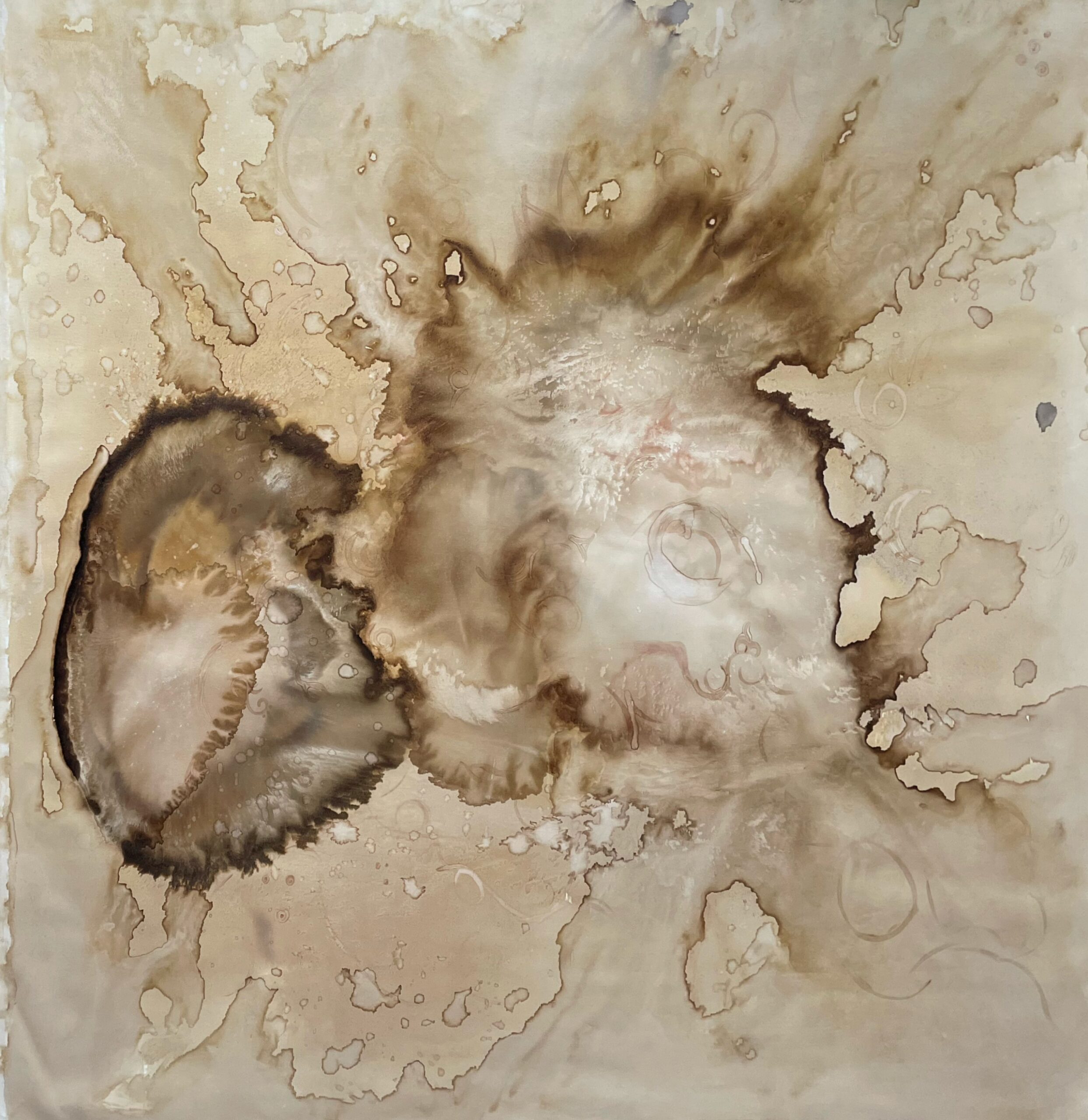 Mate, ácido cítrico, alumbre de potasio, óxido de hierro y mica natural sobre lienzo en bastidor.