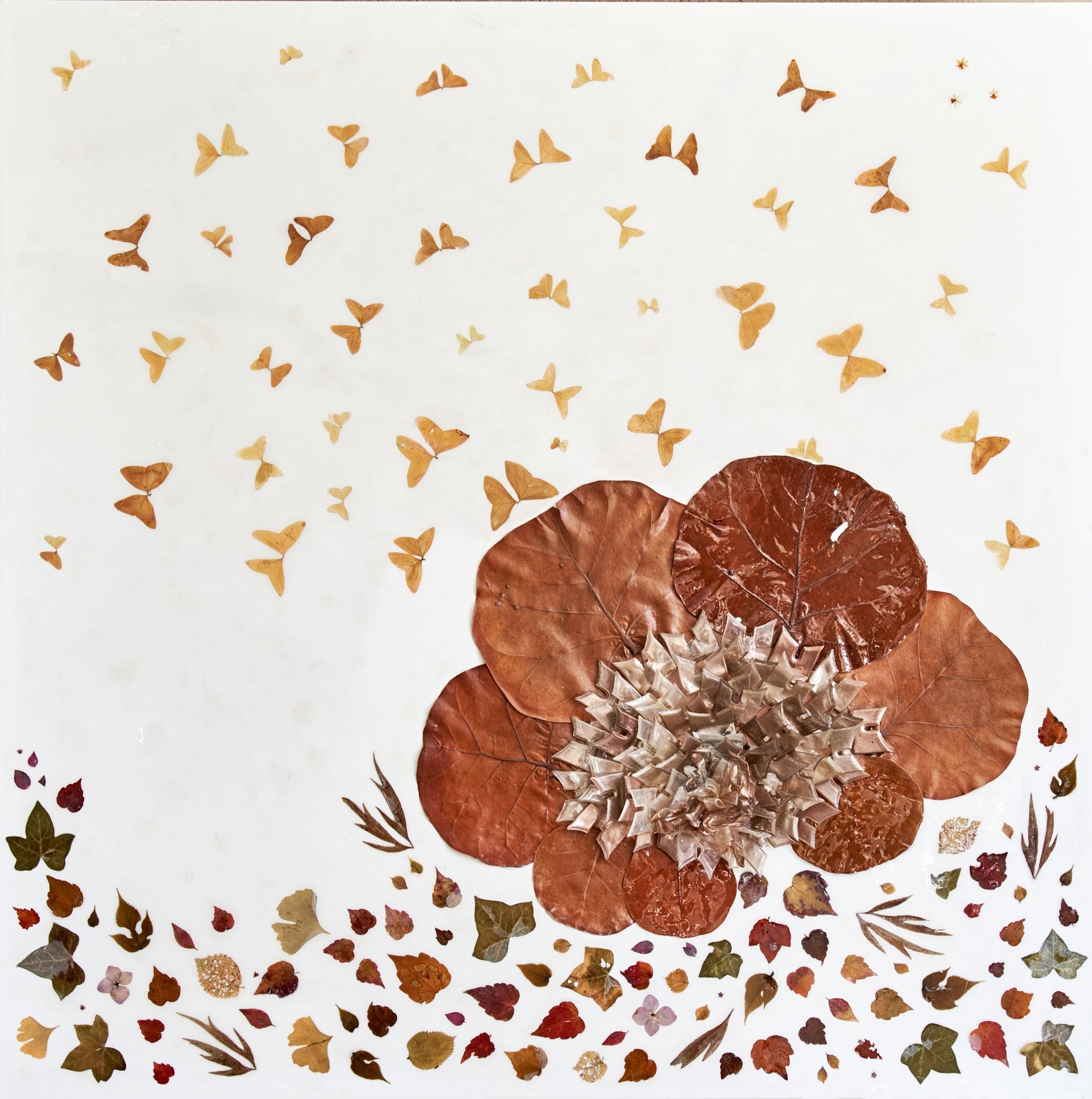 Piezas plásticas recicladas, hojas naturales, resina, pigmentos y lacas sobre bastidor de madera.